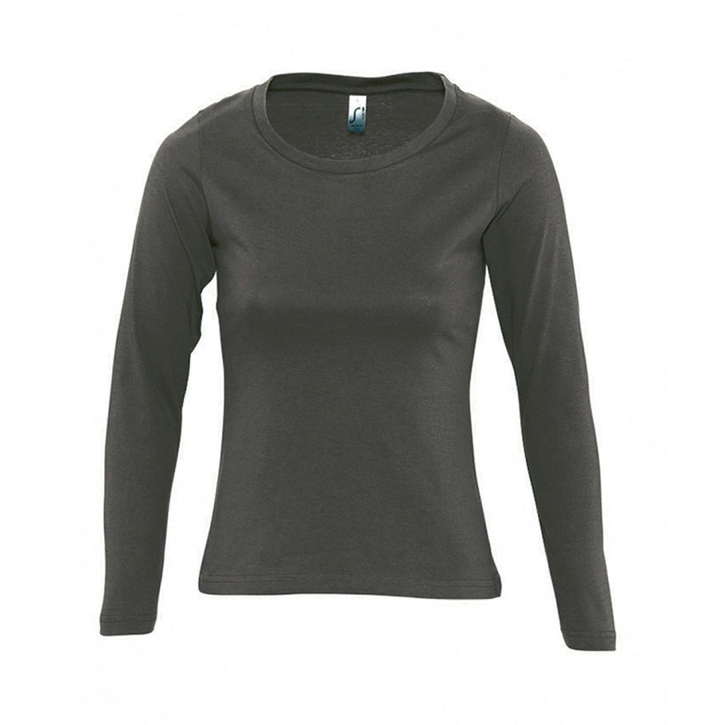 For cool casual style, the SOL'S Women's Dark Grey Majestic Long Sleeve T-Shirt with custom logo has you covered. This branded tee has a relaxed appearance and is made from 100% ringspun semi-combed cotton which is very comfortable to wear all day long. It is offered in a fitted cut with side seams for contemporary appeal, and it is complimented by a low ribbed collar and taped neck. There is also twin needle hemmed sleeves and hem to ensure long term durability. Everyone loves tees, and they can surely do with a long sleeve addition to their wardrobe. Choose a bright and fun colour and get it personalised today, it's a great way to promote your brand when used for giveaways and merchandise.