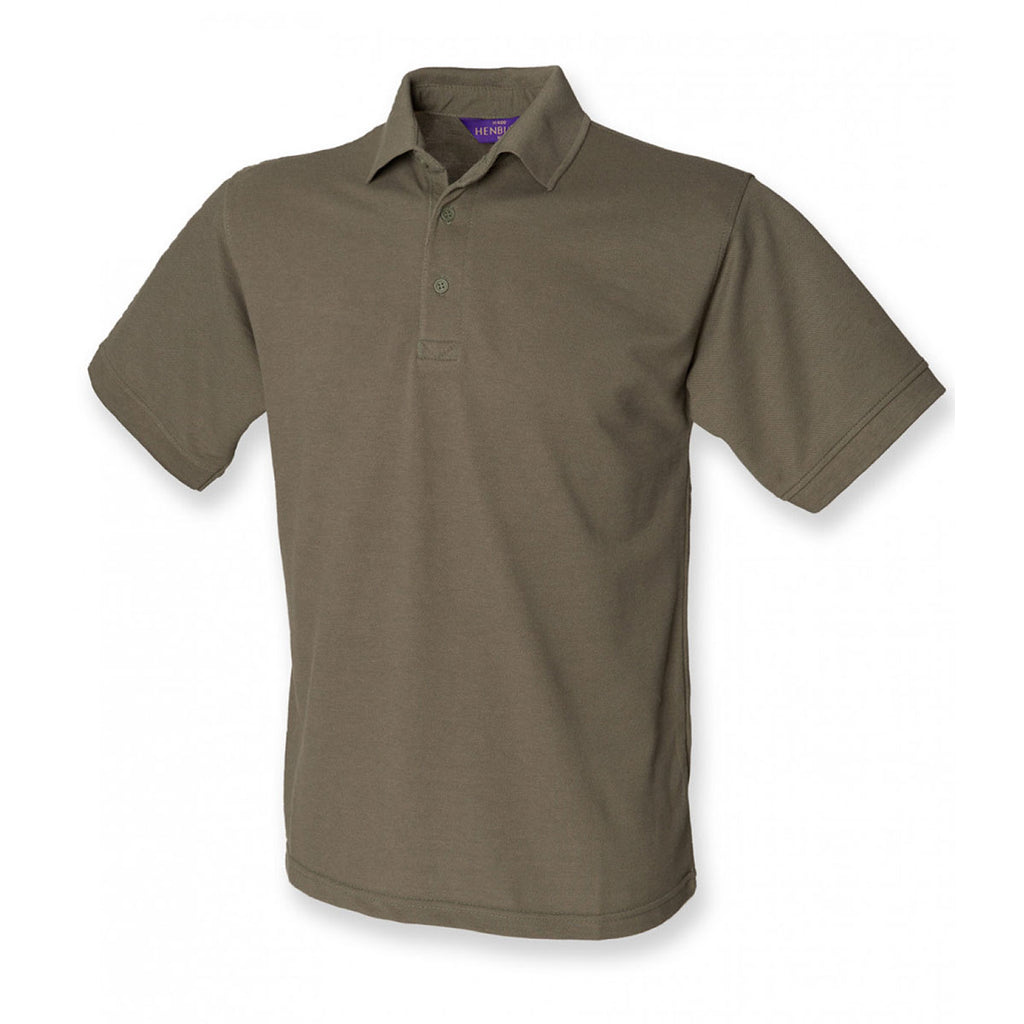 The custom logoed Henbury Men's Olive Heavy Poly/Cotton Pique Polo Shirt is made from a mix of polyester and cotton, making it ideal for activewear. With a smart and casual appearance, this polo can be embroidered with your company logo to enhance brand awareness. Moisture wicking and breathability are ensured by the blended fabric, whilst stand up collar and taped neck give it a traditional appearance. With three self colour button placket, you can wear it your way depending upon the situation. Ideal for staff uniforms as well as casual wear, this polo is designed to last with twin needle stitching and rib cuff sleeves enhancing durability. Start your promotional campaign today.