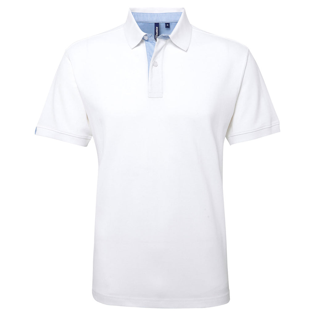 When your brand deserves a stylish treatment, choose the Asquith & Fox Men's White/Sky Cotton Polo with Oxford Fabric Insert. Unlike the traditional polo, this shirt features an Oxford fabric insert around the collar, placket, and back of the neck. The insert is a truly eye-catching element that will not only help draw attention to your company logo, but will also leave your employees, team members, and clients looking sharp. It is a fashionable choice that can easily take wearers from the office to the weekend and beyond.