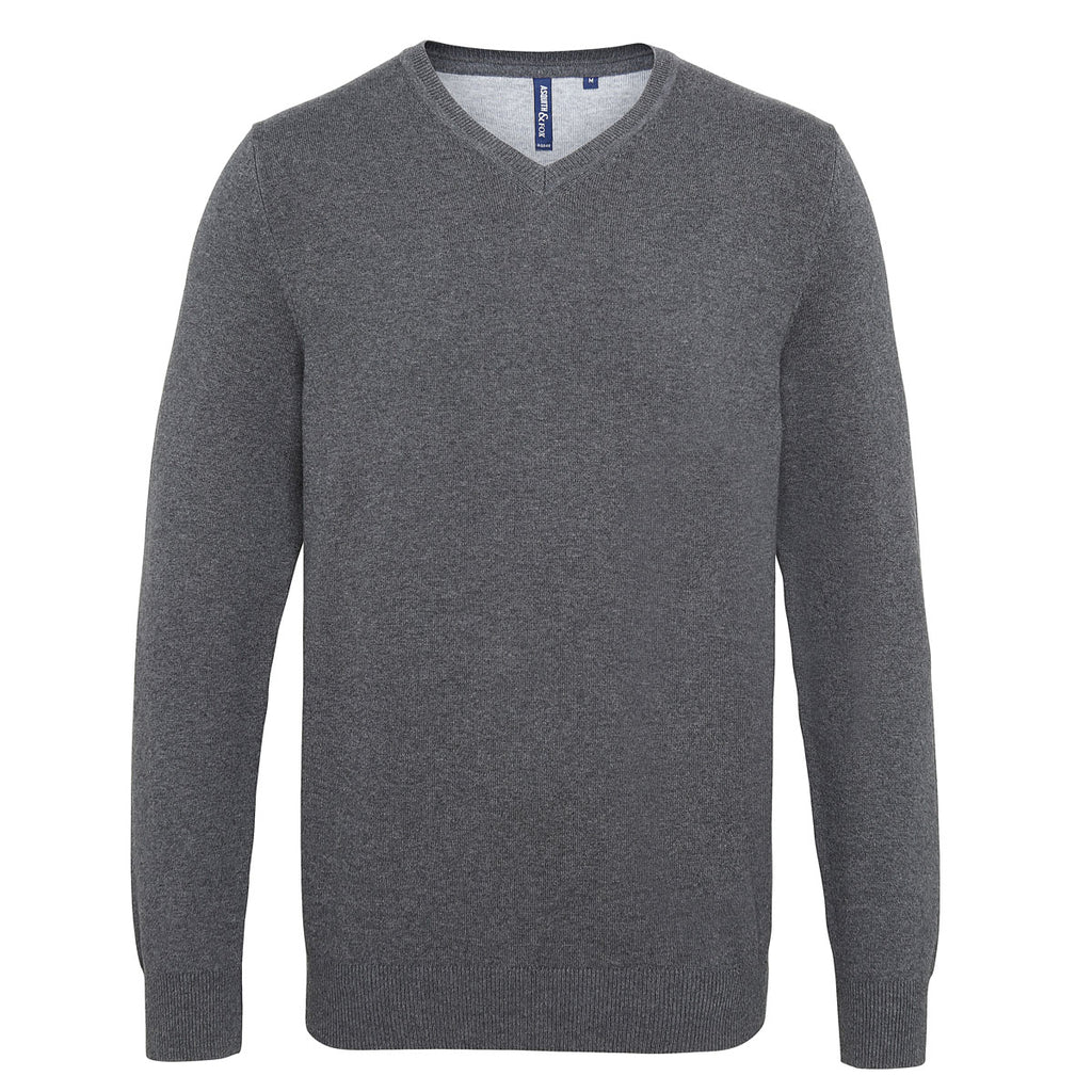 Add your company logo to something your employees and clients will enjoy wearing at the office and beyond. The Asquith & Fox Men's Charcoal Cotton Blend V-Neck Sweater has a versatile design that allows it to be worn with a shirt and tie underneath for a more formal look or without either for a more casual, everyday style. It has a sleek design that is ideal for custom decoration plus details like ribbing on the neckline and cuffs and tuck stitching that lend the sweater a polished look. It makes a fashionable corporate gift item sure to turn heads.