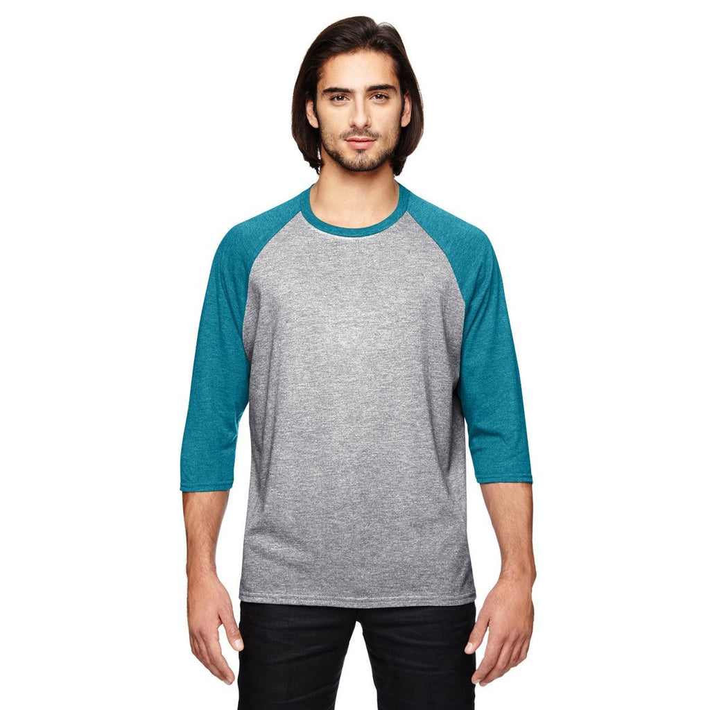 The Anvil Men's Heather Blue/True Heather Grey Triblend 3/4-Sleeve Raglan T-Shirt makes the ideal shirt to wear for the players on your company softball team. Just remember to add your corporate logo to get your company to stand out at the softball complex. The semi-fitted silhouette design and contrast color set-in collar complement the practical addition of the 3/4-long raglan sleeves. Soft cotton and rugged polyester keep the shirt in mint condition for several softball seasons. Side seam construction enhances the durability of a t-shirt made for the competitor inside each of your employees. Enjoy the durable double-needle sleeves and bottom hem, as you slide into second base.