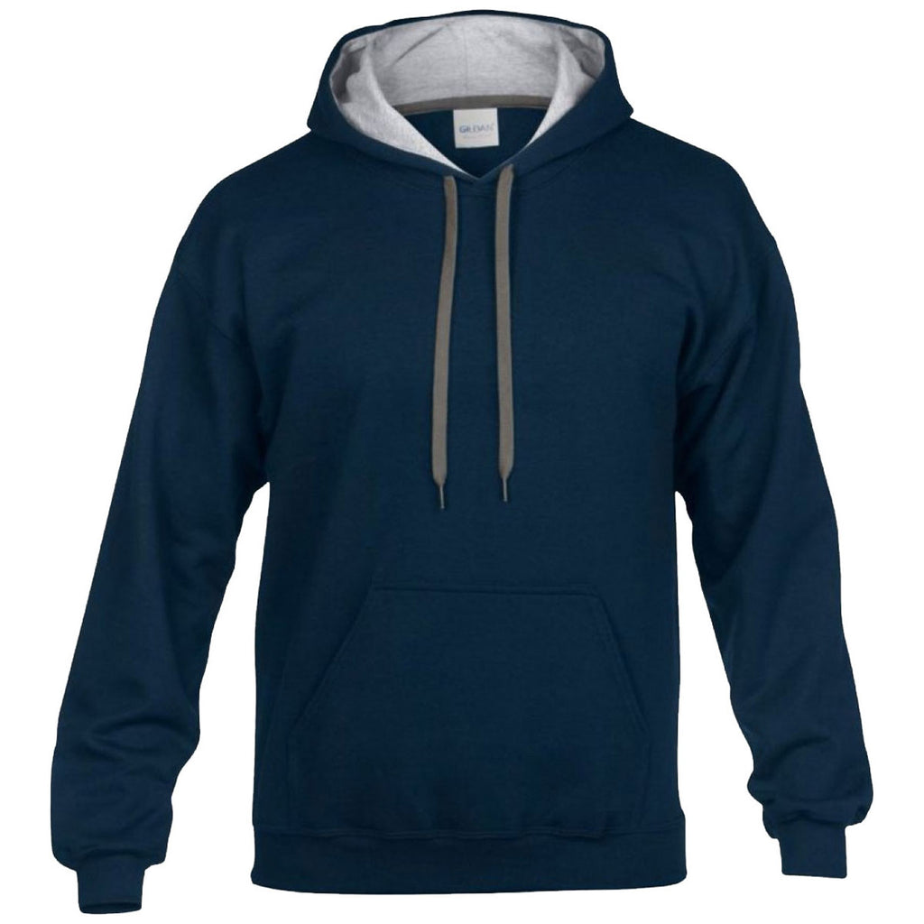 Instantly eye-catching and guaranteed to make your custom logo stand out with ease, the Gildan Men's Navy/Sport Grey Heavy Blend Contrast Hooded Sweatshirt will make an asset to any team wardrobe. As the name suggests this sweatshirt features bold contrasting colours amidst the double-layered hood and draw cord, and also features a handy front pouch pocket, ribbed trim and casual drop-shoulder style for an instant laid-back look. Super comfortable and offering plenty of free space for your personalised logo to be added, this sweatshirt is designed to stand the test of time.