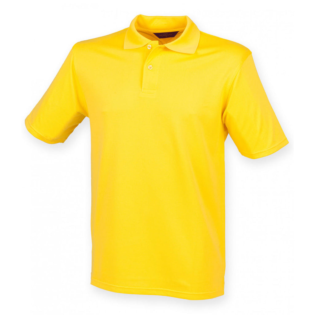Stay cool and dry during the warmer days with the embroidered Henbury Men's Yellow Coolplus Wicking Pique Polo Shirt. Made from 100% polyester micro pique, this mens polo is the ideal canvas for your corporate logo and will provide the wearer with all day comfort. Unlike traditional polos, this one is equipped with Coolplus performance wicking fabric which draws moisture away. This makes it ideal for use outdoors during hot summer days and physical activity. You can maintain a professional image thanks to the flat knit collar, taped neck and two self colour button placket. Choose from a wide range of different colours and get yours customised by Merchology today.