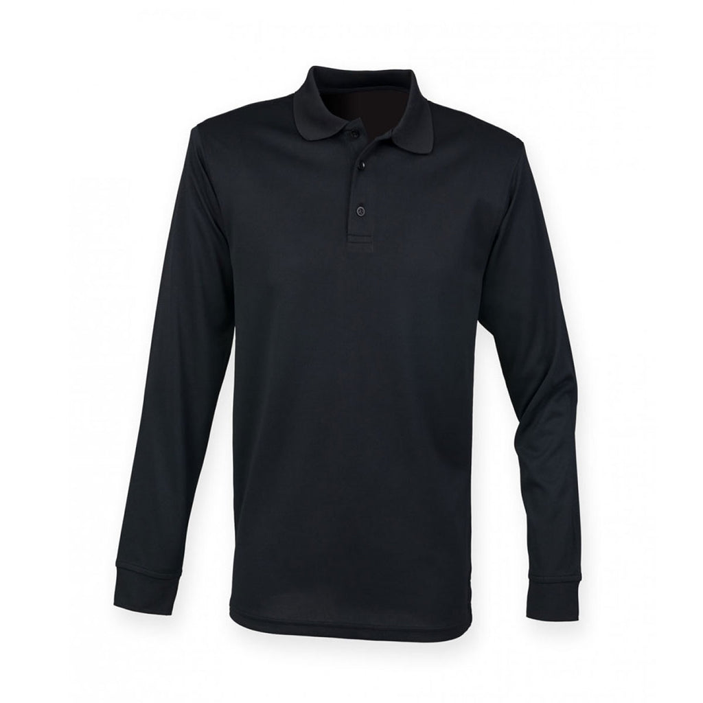 Stay cool, dry and protected from the sun with the custom logoed Henbury Men's Black Long Sleeve Coolplus Pique Polo Shirt. This men's polo is made from 100% polyester micro pique, which is a great material for corporate embroidery that will also keep the wearer dry as it features Coolplus performance permanent wicking fabric. This polo looks smart, and it's easy to care for. Details include flat knit collar and cuffs, as well as a taped neck and locker patch. Up top, there's a three self colour button placket which can be worn done up or undone according to the weather conditions. There are also side vents, and twin needle stitching for added durability. Customise for staff uniforms and giveaways today.