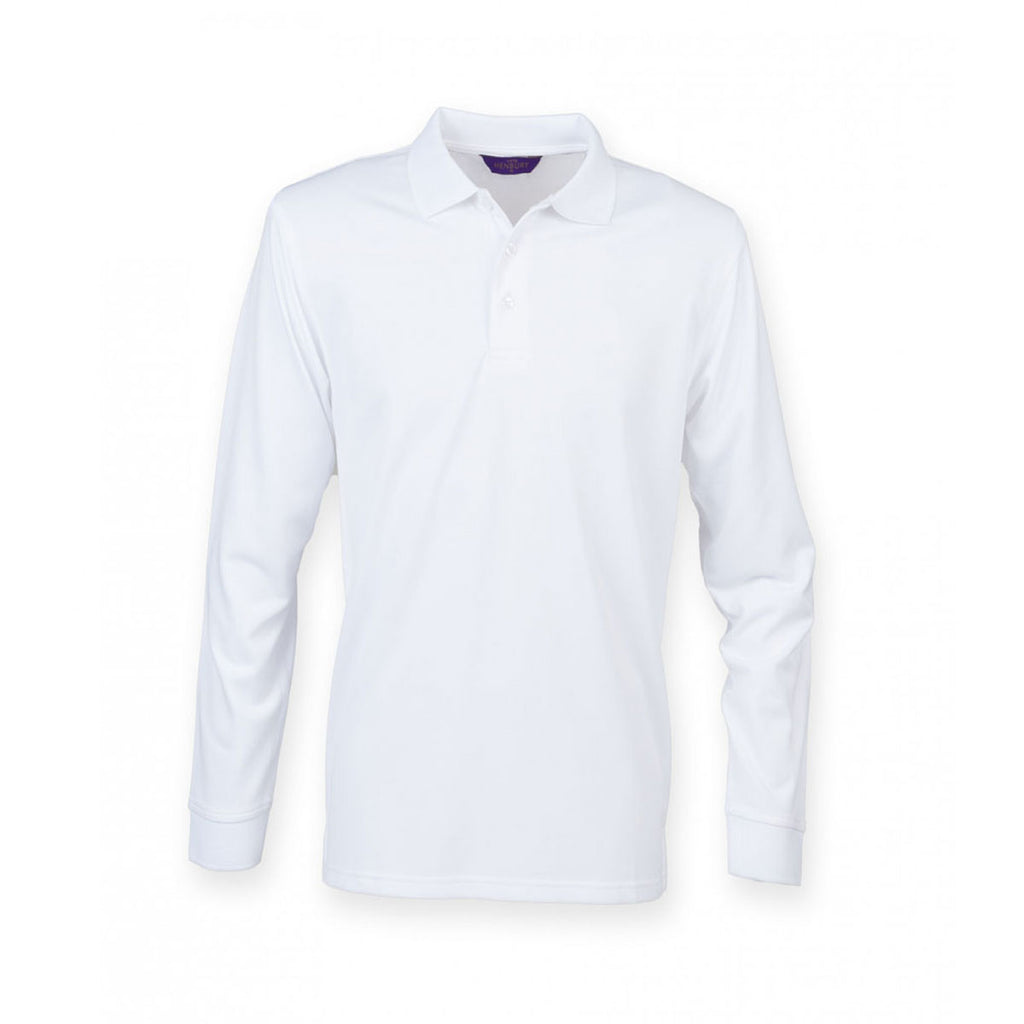 Stay cool, dry and protected from the sun with the custom logoed Henbury Men's White Long Sleeve Coolplus Pique Polo Shirt. This men's polo is made from 100% polyester micro pique, which is a great material for corporate embroidery that will also keep the wearer dry as it features Coolplus performance permanent wicking fabric. This polo looks smart, and it's easy to care for. Details include flat knit collar and cuffs, as well as a taped neck and locker patch. Up top, there's a three self colour button placket which can be worn done up or undone according to the weather conditions. There are also side vents, and twin needle stitching for added durability. Customise for staff uniforms and giveaways today.