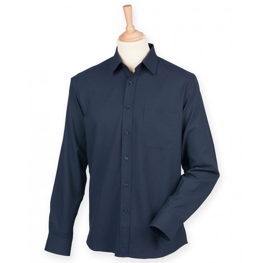 Classically styled and highly practical, the Henbury Men's Navy Long Sleeve Wicking Shirt with corporate embroidery is the ideal choice for staff uniforms. This branded mens shirt is made for the office, and is constructed from 100% polyester cofrex wicking yarn. It is crease resistant and easy to care for, and it has anti UV and quick dry properties making it ideal for long days or working outdoors. It is offered in a regular fit to suit most men, with a classic collar and left chest pocket for a classic appearance. The self colour buttons, plain back yoke, doubled folded seams and adjustable cuffs round out the details. Curved hem makes it easy to tuck in. Have yours logoed and treat your staff to new uniforms today.