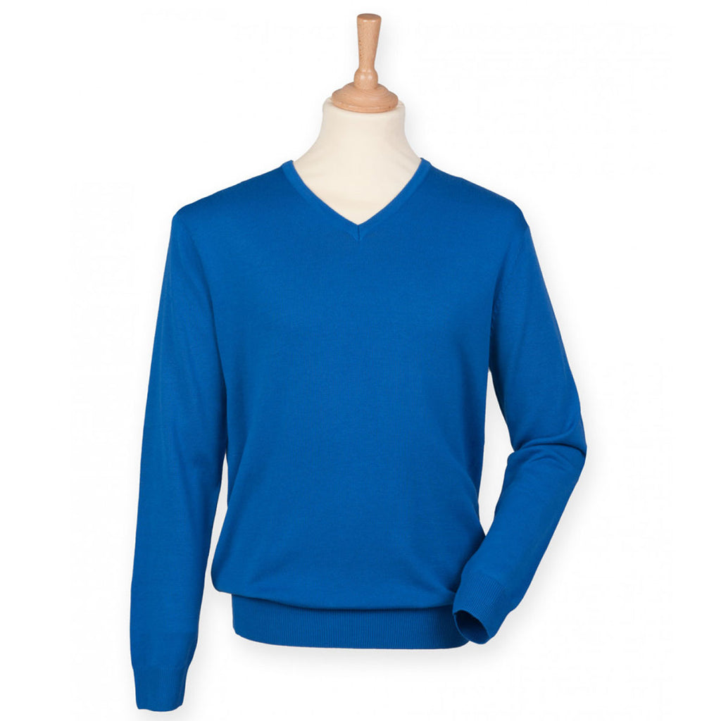 Upgrade your cool-weather wardrobe with the stylish and practical Henbury Men's Royal Lightweight Cotton Acrylic V Neck Sweater with custom logo. This logoed sweater is constructed from cotton and acrylic in 12 gauge, making it exceptionally comfortable in a streamlined form. Details include set in sleeves, as well as a 1x1 rib hem and cuffs and semi-fashioned sleeve and neck detail. The V-neck is right on trend and allows you to show off your favourite shirts. Perfect for work or play, this sweater is sure to be a hit with any man. Have yours logoed by Merchology and discover a great new way to promote your brand in style.