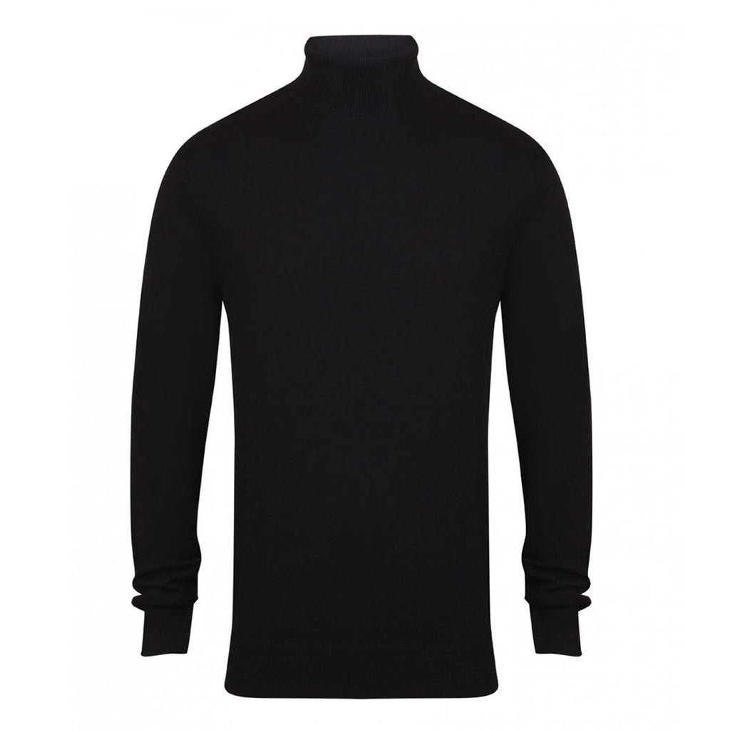 Turn your style up a notch with the practical Henbury Men's Black Roll Neck Sweater complete with custom logo. This mens' sweater is made from a blend of cotton and acrylic, which can easily be embroidered with your company logo to enhance brand awareness. It features a fun and practical roll neck, which will keep out the cold whilst ensuring a stylish appearance at all times. Made in 12 gauge fine knit, this sweater is a great weight for all year wear. It has a semi-fashioned sleeve and neck detail, as well as a cut out label. Offered in classic black, this sweater is sure to be popular for winter promotional campaigns.