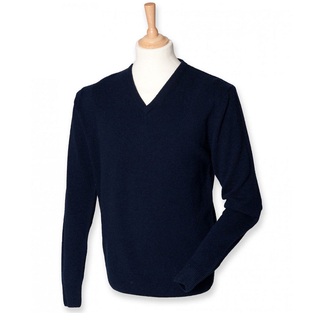 The ultimate layering sweater has arrived with the introduction of the custom logoed Henbury Men's Navy Lambswool V Neck Sweater. This branded sweater is made from 100% lambswool which is Woolmark approved, and it features 9-gauge construction for great durability and warmth. The V-neck style is a fashion forward choice for men, with set in sleeves, semi-fashioned sleeve and neck detail rounding out the look. Perfect for wearing over your work shirts, this sweater is easy to care for and is sure to last the distance. Choose from 3 classic colours and embroider your company logo today to expand your brand awareness, every man needs a go-to sweater.