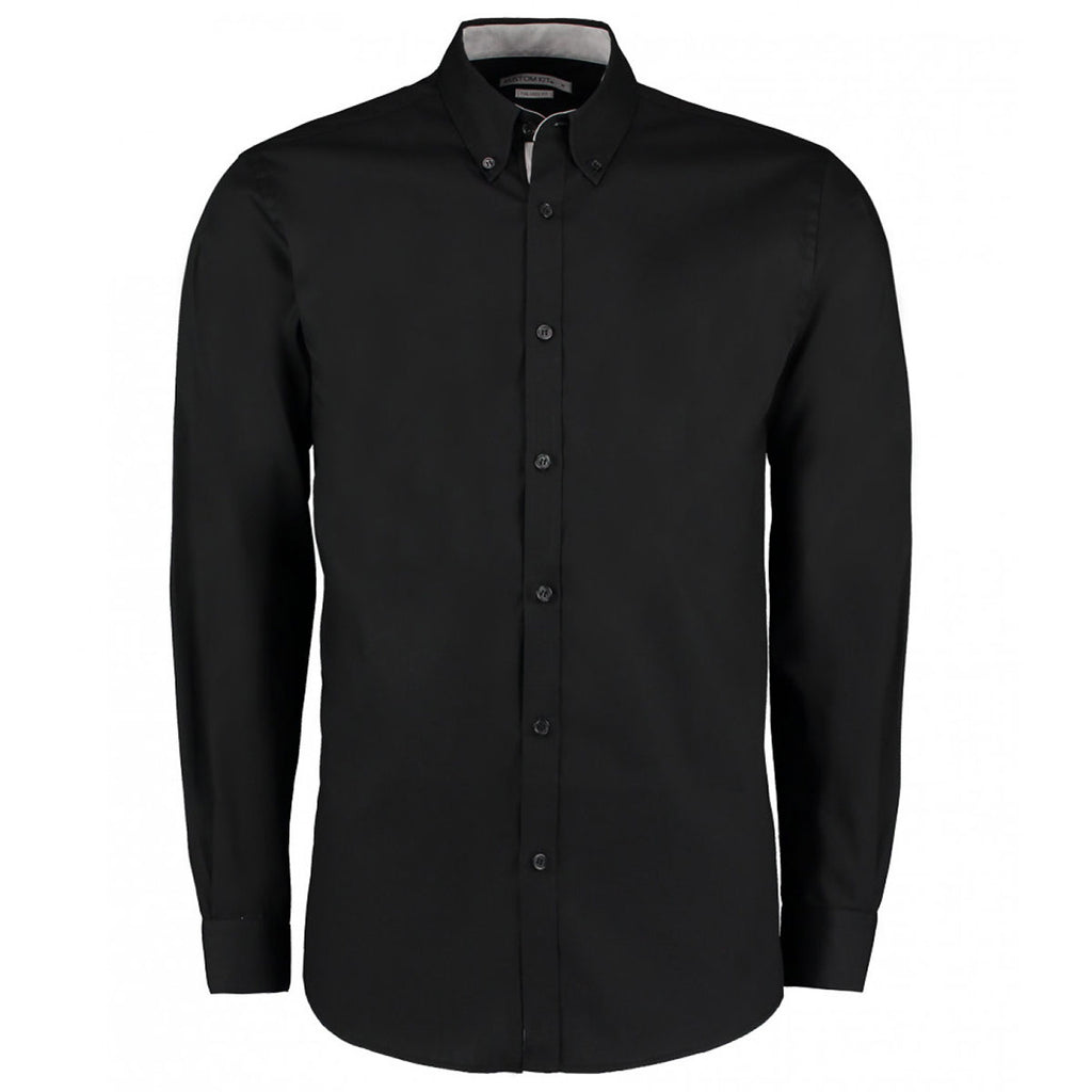 Featuring a contrasting inner collar, cuffs and centre placket, the Kustom Kit Men's Black/Silver Premium Long Sleeve Contrast Tailored Fit Oxford Shirt is a cut above the rest. Offering more than enough space for you to add your very own custom logo, creating a bespoke uniform for members of staff to wear has never been more stylish. Also providing a flattering curved hem alongside a sophisticated cuff link option, keeping your workforce looking sharp whilst feeling comfortable is a certainty with this tailored Kustom Kit shirt.