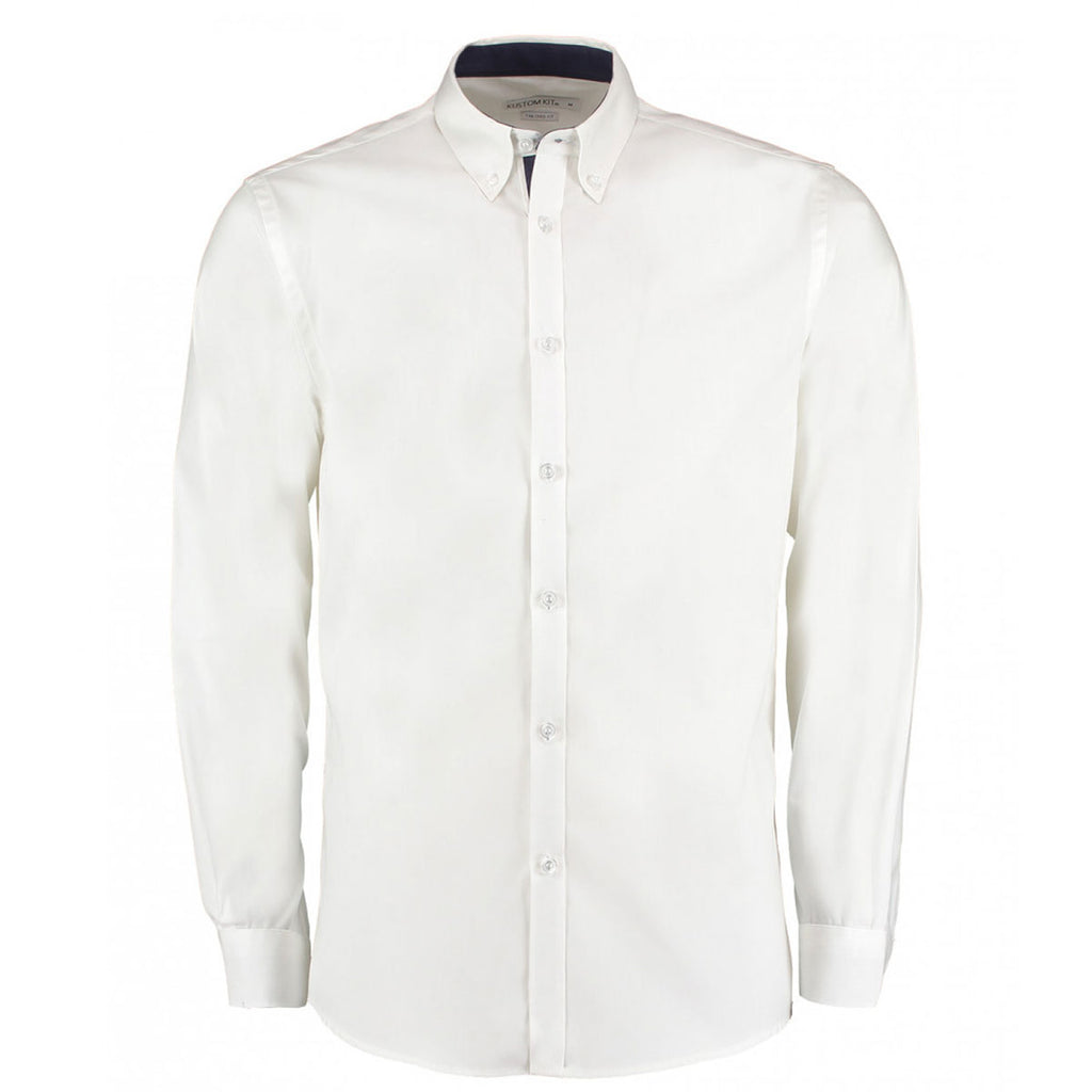 Featuring a contrasting inner collar, cuffs and centre placket, the Kustom Kit Men's White/Navy Premium Long Sleeve Contrast Tailored Fit Oxford Shirt is a cut above the rest. Offering more than enough space for you to add your very own custom logo, creating a bespoke uniform for members of staff to wear has never been more stylish. Also providing a flattering curved hem alongside a sophisticated cuff link option, keeping your workforce looking sharp whilst feeling comfortable is a certainty with this tailored Kustom Kit shirt.