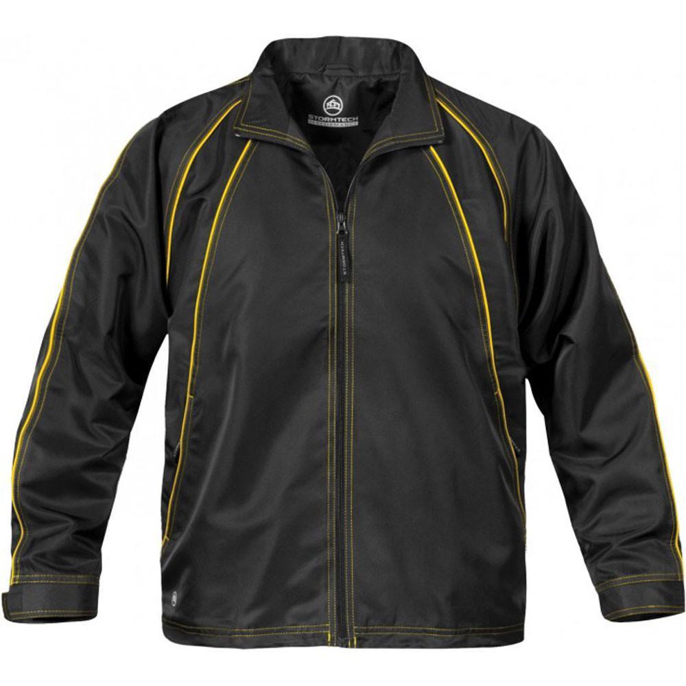 The Stormtech Men's Black/Black/Sundance Blaze Twill Jacket doesn't just look the part. The athletic style is backed up with the superior functionality of a water repellent outer shell, zippered pockets, and Velcro cuffs. The sharp contrast piping easily catches the eye and will draw it to your company logo, making this ideal team warm-up gear or outerwear.