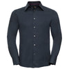 Expertly designed with modernity and style in mind, the Russell Collection Men's Navy Long Sleeve Tencel Fitted Shirt is suitable for any professional, corporate working environment. Featuring a stiffened boned collar, pearlised buttons, flattering curved hem and contrasting ribbon at the neck seam, this stylish shirt has been built for professionalism. Also offering plenty of space for you to add your very own custom logo for premium company personalisation, creating a bespoke workforce uniform guaranteed to provide both comfort and sharp style is yours for the taking.
