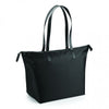 The BagBase Black Riviera Tote mimics the look of fashionable designer bags. This on-trend style will perfectly showcase your custom logo or design and give your brand an undeniable sense of style. Made of a durable nylon twill, it features long carry handles made of high-quality materials. Authentic metal accents also adorn the exterior, making this tote bag an incredibly attractive accessory. The large interior features a baseboard and pouch pocket, making it incredibly easy to carry. If you want your brand to exude style, add your logo to the side of this ultra stylish bag.