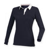 The Front Row Women's Navy Premium Superfit Rugby Shirt has a preppy polish that will instantly elevate your brand. Simply add your custom logo or design to the front of this attractive item to give your signature and added sense of style. Available in highly wearable color options, it features eye-catching details like a contrasting rugby collar, statement stitching, and subtle plastic buttons on the placket. The super soft fabric features a peached finish, while the slim fit is incredibly feminine and alluring.