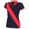 The Front Row Women's Navy/Red Diagonal Stripe Cotton Pique Polo Shirt is a sophisticated sportswear inspired item. The bold color options contrast beautifully, ensuring your brand's custom logo or design will have an unmistakable sense of style. The preppy and polished style is made even better by the attractive and figure flattering slim fit. Contrasting accents at the three-button placket, flat knit collar, and cuffs ensure this timeless item is one that the ladies on your team will wear with pride.