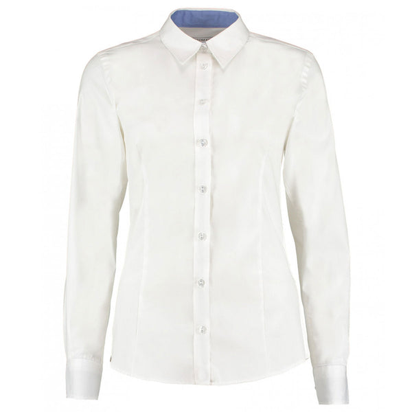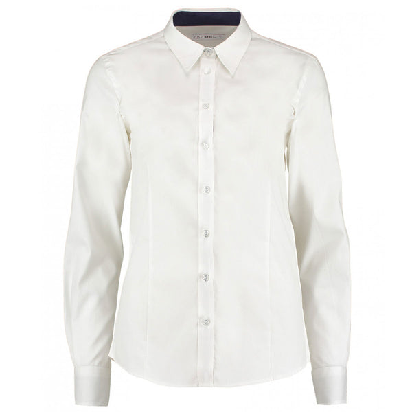 Kustom Kit Women's White/Navy Premium Long Sleeve Contrast Tailored Fit Oxford Shirt