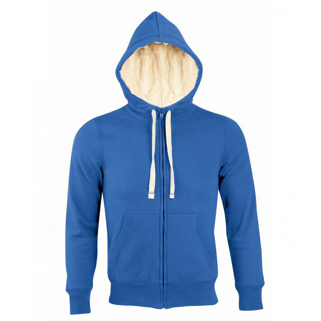 For maximum protection from the cold, whip on the SOL'S Unisex Royal Blue Sherpa Hooded Jacket with custom logo. This logoed hoodie is made from a blend of 80% cotton and 20% polyester, and the body and hood have been lined with 100% polyester cream Sherpa to add an extra layer of warmth and exceptional comfort. It is classically styled and features drop shoulder, cream drawcord and a full length covered zip. There are also front pouch pockets for storage and hand warming, as well as deep ribbed cuffs and hem to lock out the cold. Start promoting your brand with this popular hoodie. Customise with Merchology today.