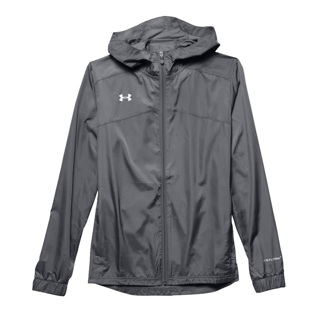 What if there was a great shell jacket out there that was light, strong, comfortable, and capable of handling everything you could throw at it? Of course, we're not asking a rhetorical question here. We've really found it. This Under Armour Women's Graphite Futbolista Shell features a water-resistant finish so that you don't have to worry about those pesky rainy days. And it nails all of the other details too, right down to the added material on the back hem for better coverage and the uniquely shaped hood. All you need to make it uniquely yours for use or for giving away? Your logo on the front, custom embroidered by Merchology.