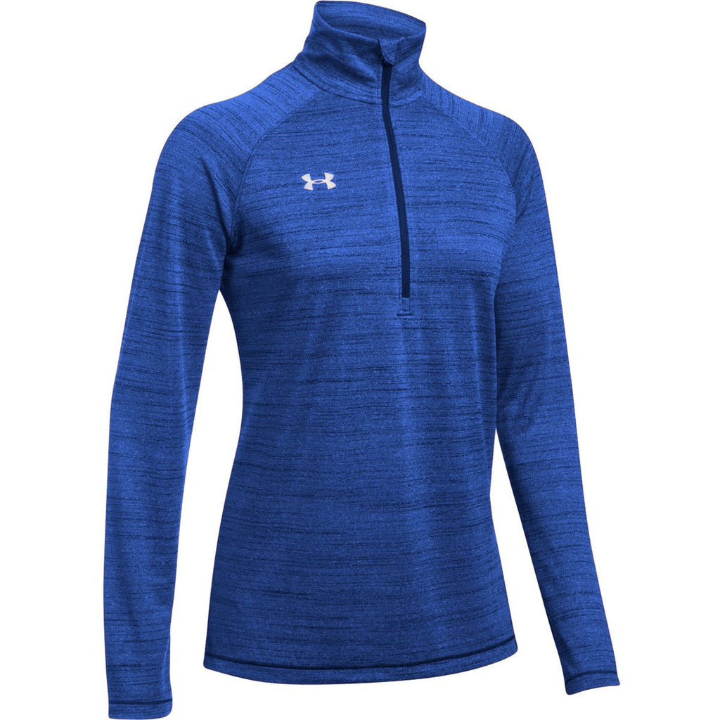 If you're interested in the warmth and protection of a 1/4 zip but not the usual bland style, there may be no better option for you than the Under Armour Women's Heather Royal Steel Stripe Tech 1/4 Zip. This microstripe zip is comfortable, light, and 100% polyester, featuring Flatlock raglan sleeves. The updated Tech fabric has a softer, more natural feel for all-day comfort to keep you moving. Add your own embroidery or custom logo and you'll stand out from the crowd in style.