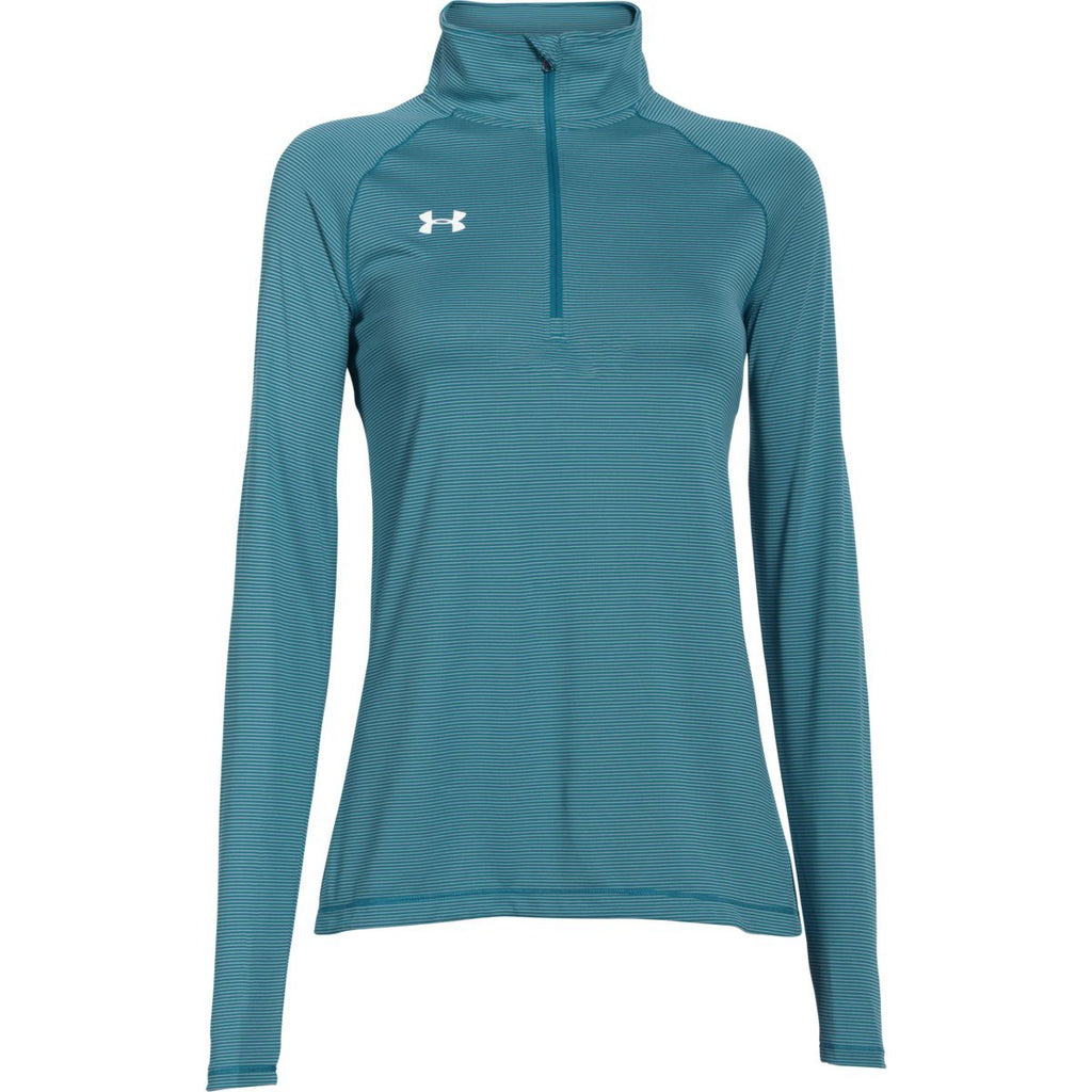 If you're interested in the warmth and protection of a 1/4 zip but not the usual bland style, there may be no better option for you than the Under Armour Women's Coastal Teal Steel Stripe Tech 1/4 Zip. This microstripe zip is comfortable, light, and 100% polyester, featuring Flatlock raglan sleeves. The updated Tech fabric has a softer, more natural feel for all-day comfort to keep you moving. Add your own embroidery or custom logo and you'll stand out from the crowd in style.