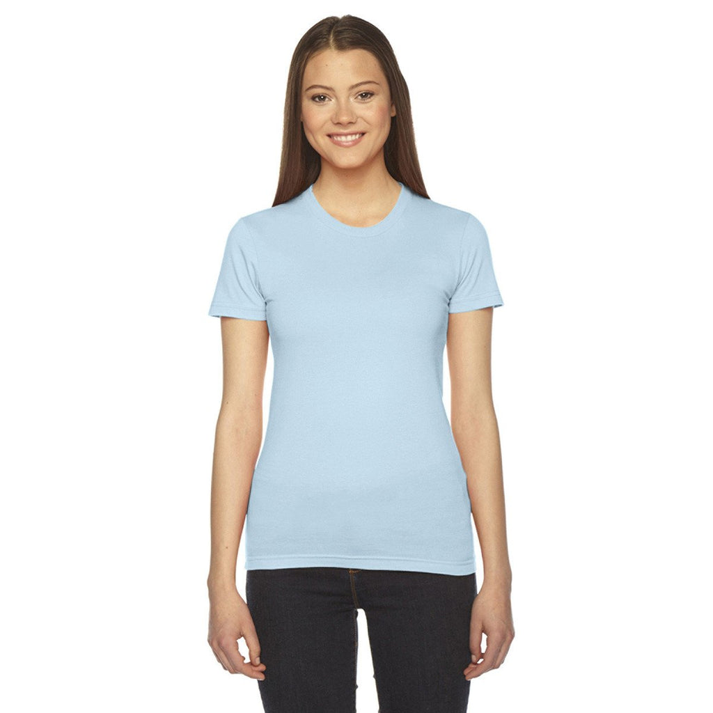 Ever wanted a comfortable T-shirt that didn't try to be something it's not? We've got a T-shirt that knows what it is and does it extremely well. This T-shirt is comfortable thanks to 100% ingspun combed cotton-which is exactly what a tee should be. It's form fitting, with a tapered waist and comfortable shoulders-exactly what a tee should be. And it's durable enough to withstand near-daily washing for a long time-exactly what a tee should be. The only thing this American Apparel Women's Light Blue Fine Jersey Short-Sleeve T-Shirt is missing to become the ideal T-shirt is your own custom logo printed on the front.