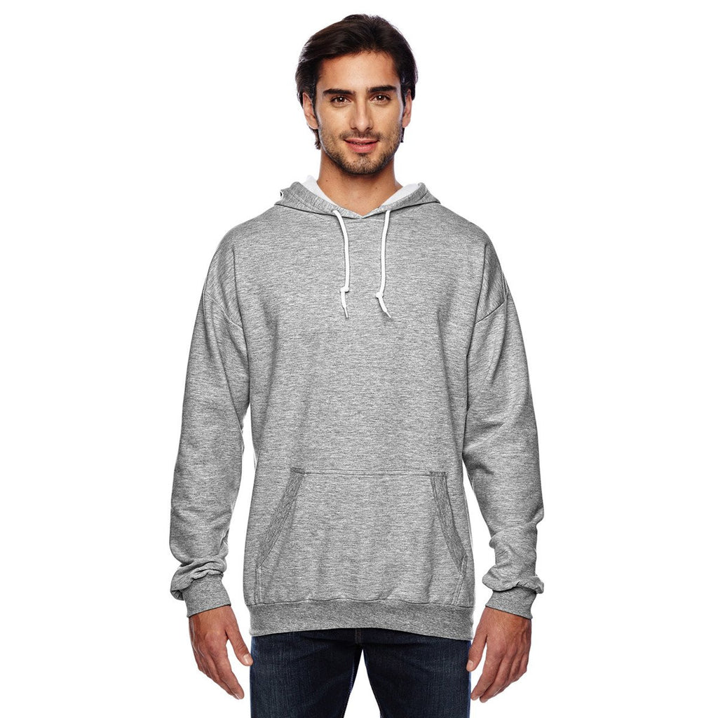When the weather turns frosty, you put on the Anvil Men's Heather Grey Pullover Hooded Fleece Sweatshirt to remain comfortable throughout the day. Seventy-five percent preshrunk ring spun cotton and 25% polyester form a potent one-two fabric punch. The unlined hood and white draw cords keep your head warm during early morning walks. Use the spacious pouch pocket to store your iPod and smartphone. Rib spandex cuffs and waistband conform to fit all types of body shapes and sizes. The two-inch rolled forward shoulder design makes the hooded fleece stand out at casual corporate events. Add your corporate logo to increase brand exposure.