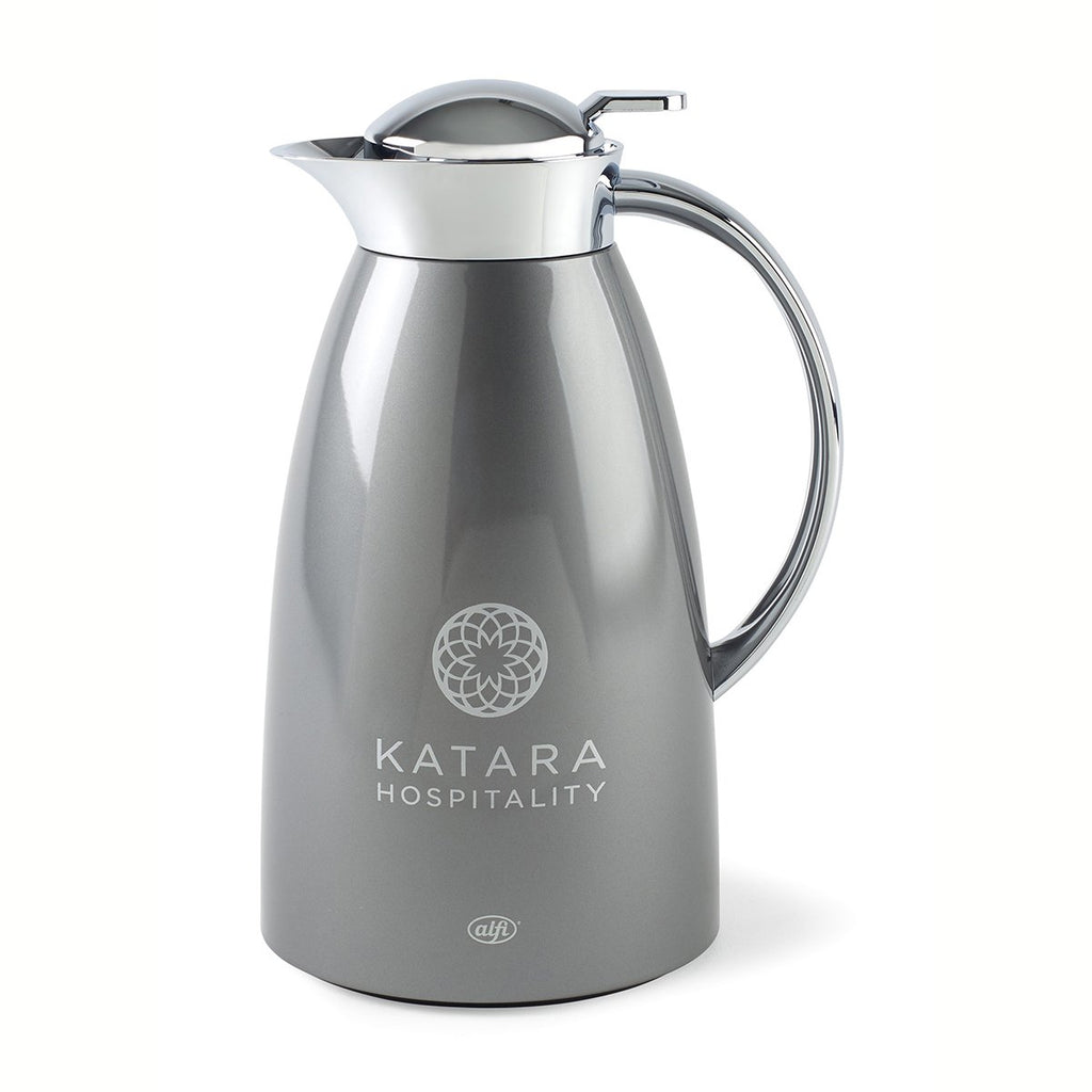 Create custom Carafe imprinted with your company logo to maximize your brand awareness and that recipient will love taking home with them. Serve chilled iced tea or steaming hot coffee during outdoor picnics courtesy of alfi Laquered Metal Space Grey Gusto 1.0L Glass Vacuum Insulated Carafe boasting superior heat and cold retention for up to 12 and 24 hours respectively.