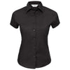 Simple and effortlessly professional, the Russell Collection Women's Black Short Sleeve Easy Care Fitted Shirt offers a stylish alternative to a long sleeve option. Ideal for professional working environments and certain to suit a variety of body types, this shirt features a flattering fitted style, classic collar and capped sleeves for a distinctive edge. Guaranteed to feel comfortable and be easy to look after at home, this Russell Collection shirt offers more than enough space for your very own custom logo to be added - making apparel personalisation simple!