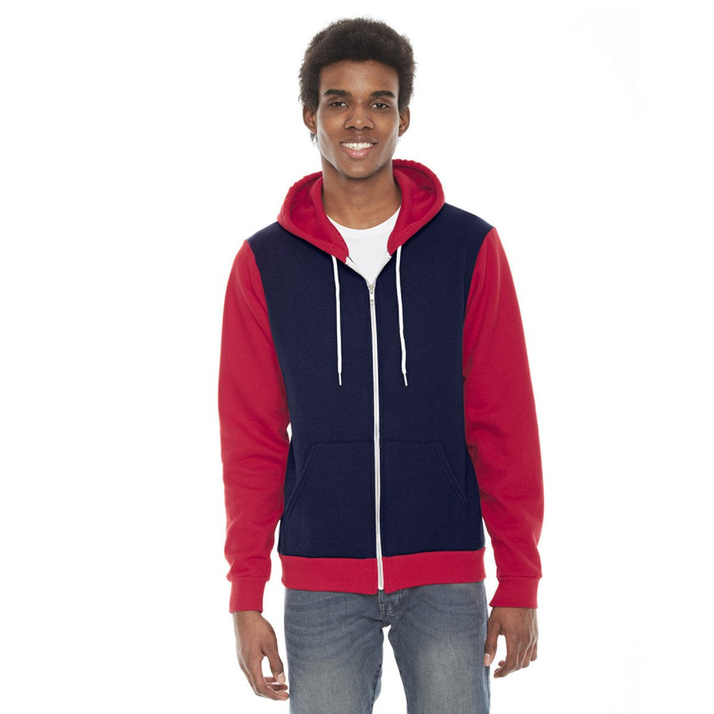 Allow us to introduce you to the classic hoodie. The American Apparel Unisex Navy/Red Flex Fleece Zip Hoodie features a 50%-50% cotton-polyester blend that's not only comfortable, but easy on the eyes as well. And the hood features a finished polyester drawcord that's more durable than those cheap drawcords you've been using in the past, only to watch them break after repeated washings. With a sly pouch pocket and a sideseamed design, this hoodie has everything you could want in terms of classic style and functionality. And if that's just too much "classic" for you, you can always update this hoodie with your own custom printing.