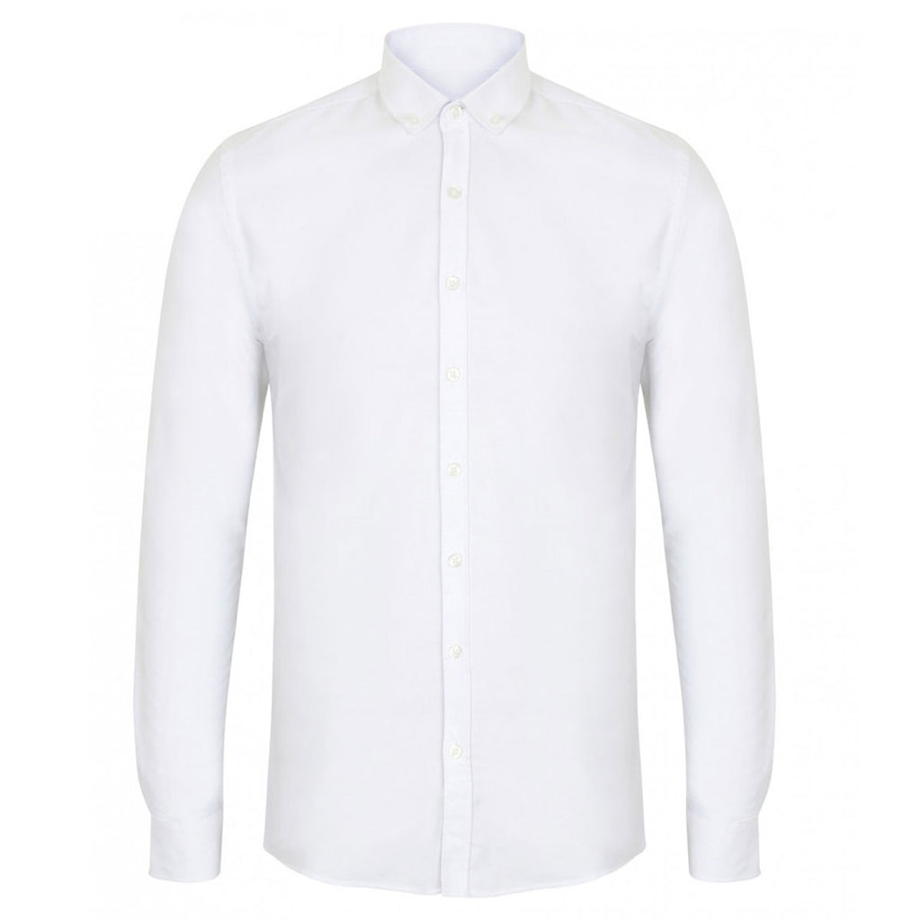 For the fashion-conscious individual, the branded Henbury Men's White Modern Long Sleeve Slim Fit Oxford Shirt will fit the bill. This long sleeve oxford shirt is made from a blend of cotton and polyester and can be embroidered with custom logo for staff uniforms and giveaways. It has a stylish slim fit that is right on trend, with the short point button down collar helping to ensure a smart appearance at all times. This shirt also has pearlized buttons, back yoke, back darts and adjustable cuffs. Wear it out or tucked in, the curved hem will keep you looking great no matter what. Tag free, practical and designed to last, all that's left to do is arrange your corporate embroidery with Merchology.