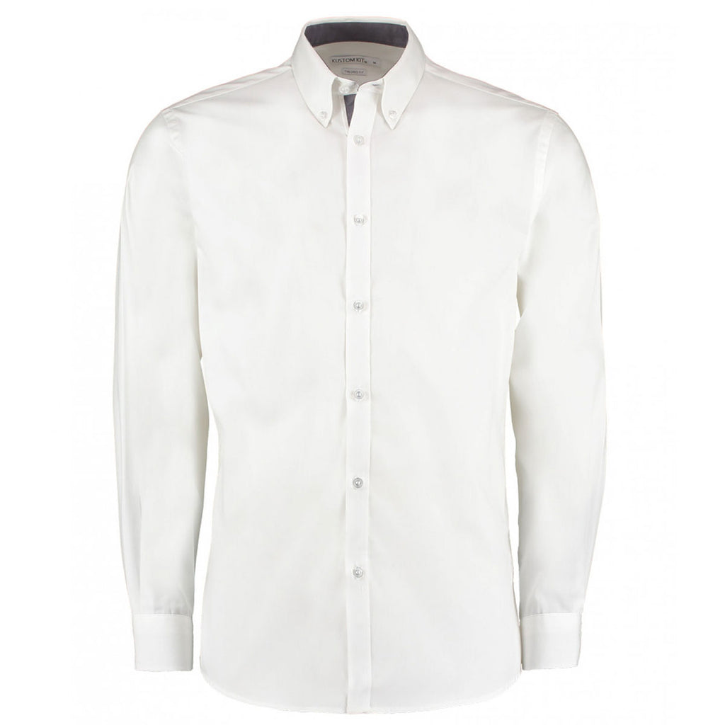Featuring a contrasting inner collar, cuffs and centre placket, the Kustom Kit Men's White/Charcoal Premium Long Sleeve Contrast Tailored Fit Oxford Shirt is a cut above the rest. Offering more than enough space for you to add your very own custom logo, creating a bespoke uniform for members of staff to wear has never been more stylish. Also providing a flattering curved hem alongside a sophisticated cuff link option, keeping your workforce looking sharp whilst feeling comfortable is a certainty with this tailored Kustom Kit shirt.