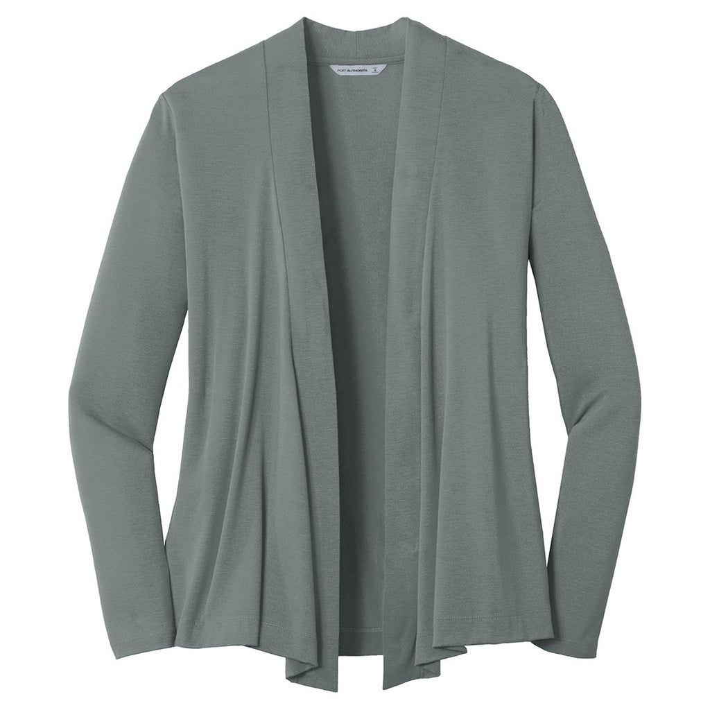 Pair the custom logged Port Authority Women's Grey Smoke Concept Knit Cardigan with just about any tee to make a favorable fashion impression on everyone you meet at the next company event. With all eyes on the cardigan, display the custom logo attached on the large imprint area to promote your products and services. Put on the cardigan to prevent an evening chill from making you uncomfortable and take the chic corporate apparel off when you walk into a bustling industry trade show. Your employees will appreciate the stylish spin on the usual piece of corporate apparel.
