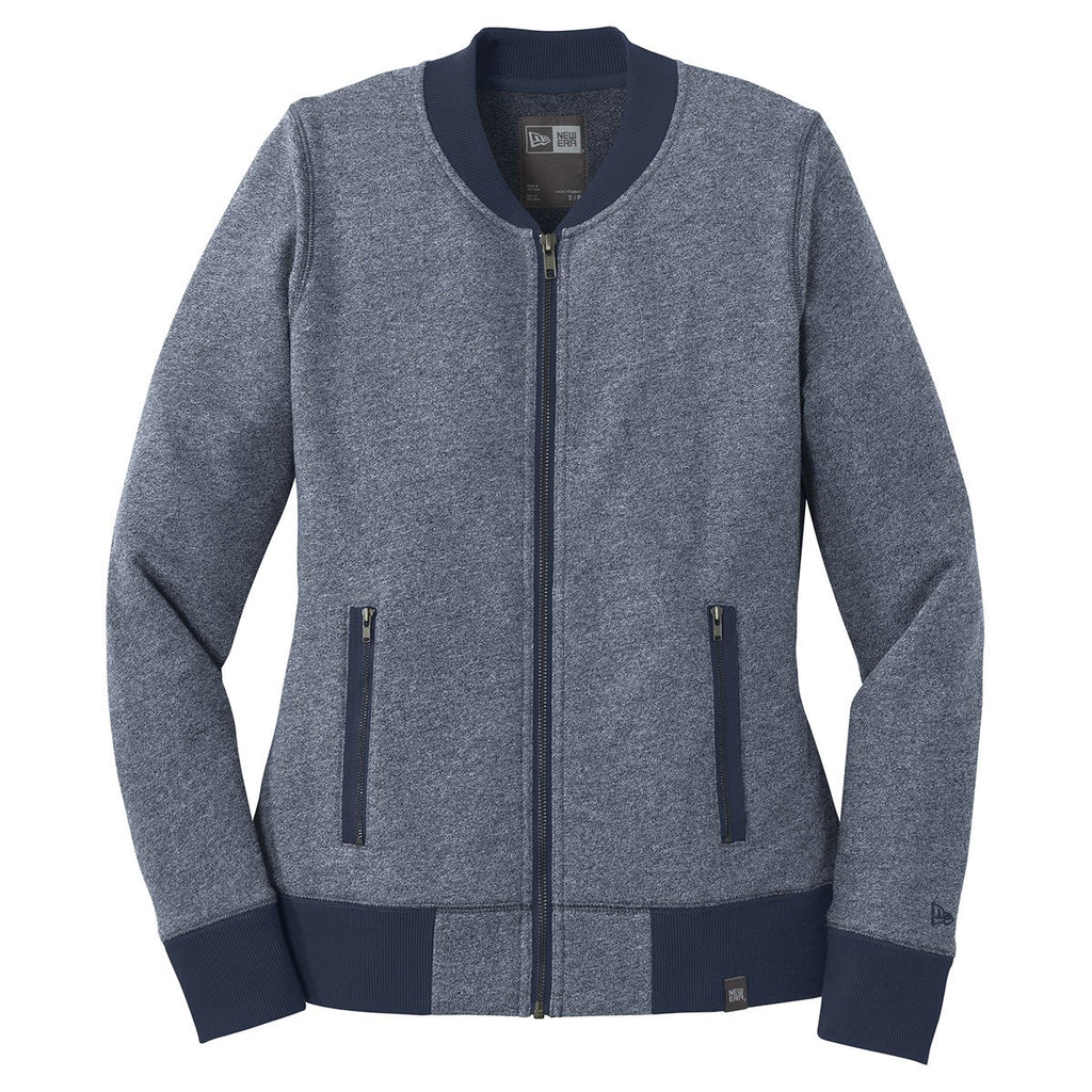 Match our national pastime with fashionable corporate apparel and you have the embroidered New Era Women's True Navy/True Navy Twist French Terry Baseball Full-Zip. Exposed black nickel zippers and contrast rib knit cuffs up the fashion ante for corporate apparel. The chic full-zip contains a blend of cotton and polyester to create a smooth fabric that withstands the punishment delivered by participating in outdoor activites. Sueded French terry design will turn heads at the next corporate event. Make sure to keep customer prospect eyes glued to the elegantly designed full zip by adding your corporate logo on the large imprint area.