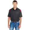 Whether your team is working on a race car or racing go-carts, this Dickies Men's Black/English Red 4.6 Oz. Performance Team Shirt will definitely show off your company's embroidered logo. It is an advantage to look good while playing hard. The fabric is treated to easily release stains and has moisture wicking capabilities. The shoulders have contrast color block inlays and the square tail design can be worn untucked. It features a banded collar with top-stitching, and two chest pockets. For convenience, the left pocket has a pencil division. All color combinations come in sizes S to 3XL. Choose black with red, black with smoke, dark navy with smoke, or smoke with black.