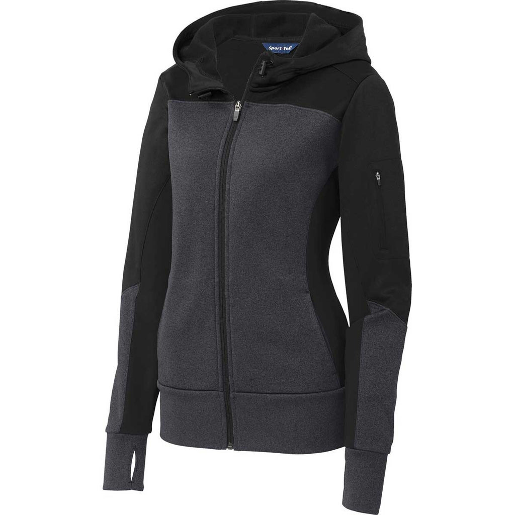 Contrast coloring and a smooth matte finish highlight the design features of the Sport-Tek Ladies Black/Graphite Heather/Black Tech Fleece Colorblock Full-Zip Hooded Jacket. The double knit jacket resists snags and pilling. One-hundred percent highly breathable polyester ensures you remain comfortable throughout a long hike. Princess seams and integrated front pockets offer the double benefits of sleek design and long lasting performance. The front pockets allow you quick access to electronic devices. Attach a custom logo on the jacket to put your brand in front of potential customers. Place your hands in the thumbholes to keep your hands warm.