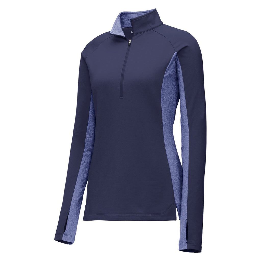 The logoed Sport-Tek Women's True Navy Heather Sport-Wick Stretch Contrast 1/2-Zip Pullover features a gently contoured silhouette that makes the layering piece both comfortable and stylish. With all eyes upon you, display the corporate logo you attached on the large imprint area to attract more interest in your products and services. Moisture wicking technology keeps you comfortable all day long, and ready for anything. Reflective details on the right sleeve and lower back are a necessary addition for late night workouts. This layering piece is one that both creates unity for your team, and outfits them with a 1/4 zip they will want to wear more than just at the office.