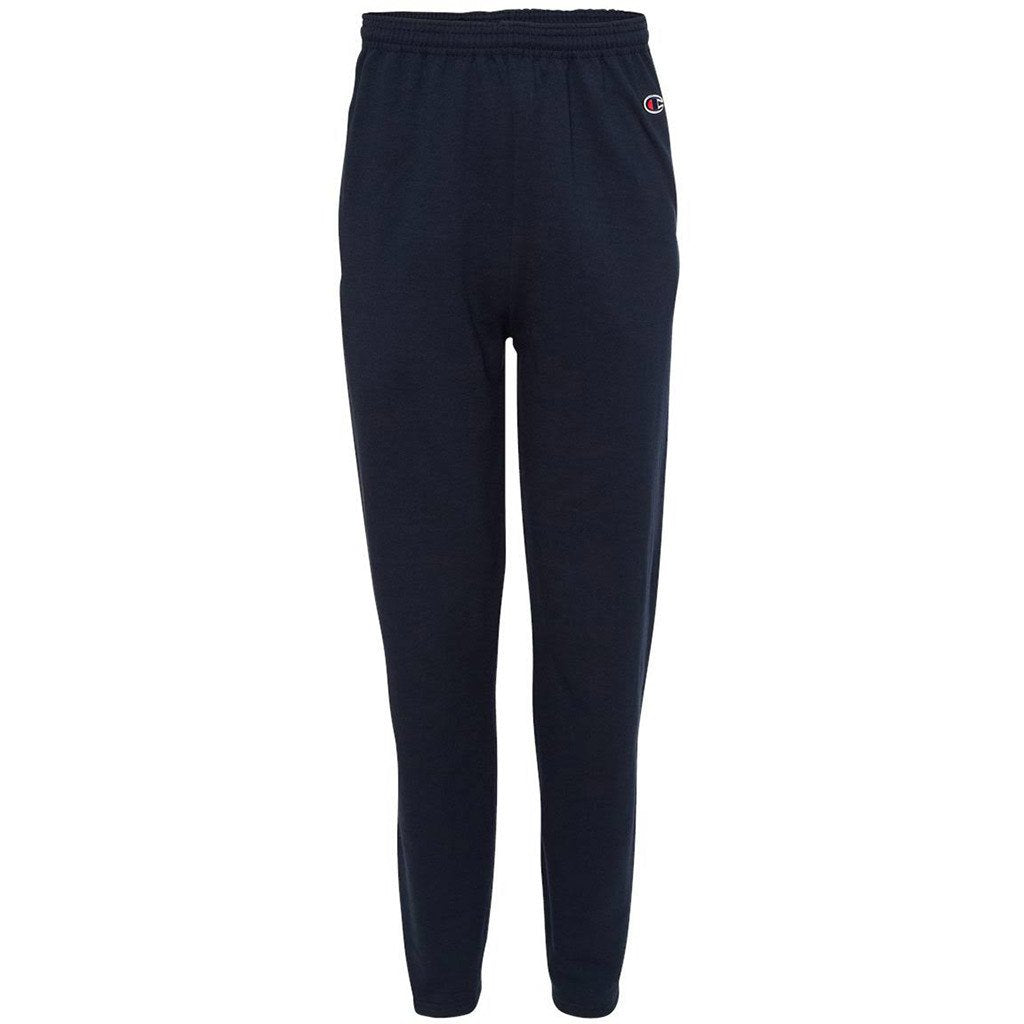 Designed with 50% recycled polyester fibers from plastic bottles, the Champion Men's Navy Eco 9-Ounce Open-Bottom Fleece Pant with Pocket makes the ultimate eco-friendly statement. Rugged polyester complements super soft cotton to create a versatile pair of athletic pants. Champion has placed its iconic "C" logo on the left hip, which leaves the right side open for you to add a custom logo. Champion includes a covered elastic waistband and inside drawcord that conforms to most body shapes and sizes. This embroidered apparel offers plenty of room for you to promote your company during community recreational activities.
