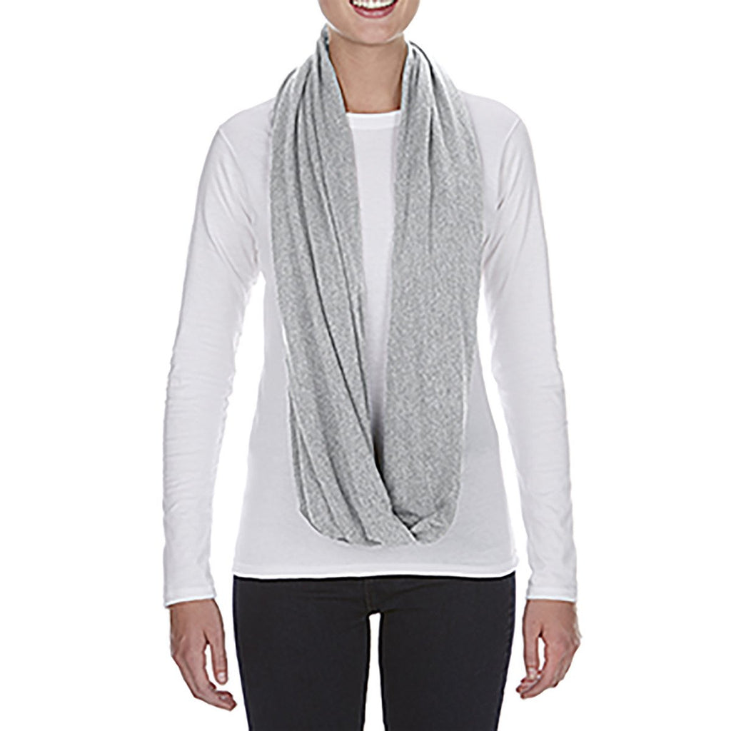 The lightweight Anvil Women's Heather Grey Infinity Scarf contains cotton, rayon, and polyester. Rayon adds strength to the scarf to keep your neck and ears warm. Super soft cotton feels smooth against the skin. The 35-inch length allows you to create different looking styles to match your fashion preferences. Wear the scarf over a cardigan sweater or a thick parka. Attach your corporate logo to expand the presence of your company at professional networking events.