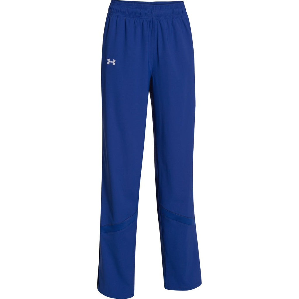 In short, you need this pair of Under Armour Women's Royal Pre-Game Woven Pants. Not only do they offer all of the above, they include features like reverse fabric leg insets, open side seam hand pockets, and a water repellant system to help keep you try. Add your team's logo to these pants to represent them at games, at practice—or simply around the house.